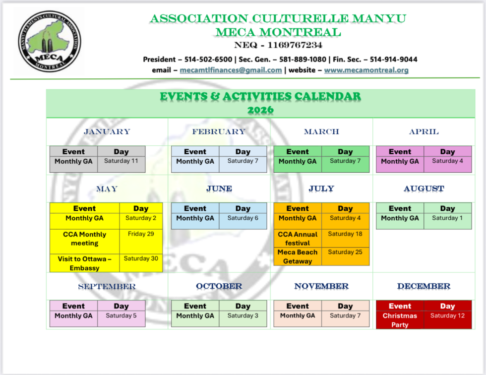 Manyu Elements from the Republic of Cameroon, residing in Montreal and its environs, conscious of the need to protect and promote the socio-cultural values of Cameroon, willing to foster the spirit of unity, love and solidarity among Cameroonians in Montreal and other cities in Canada, do hereby establish Association Culturelle Manyu also known as Manyu Elements Cultural Association (MECA) Montreal. The following laid down rules and regulations will serve as a guide for the smooth running of The Association
